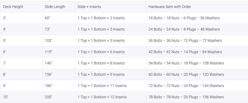 IMPORTANT: Please read for important information. In this material we have tried to provide some requirements stated in the CPSC Handbooks, ASTM F2373-11, F1487-11 and F1148-09. However, we in no way intend for this to be a complete list of requirements. Also these publications are updated frequently with changes therefore, you should read these publications yourself to determine if any part or installation could prove a danger to a child. To help keep children safe from harm, review installation and maintenance instructions before installing equipment. Due to the thermo dynamics and lower heat transfer properties of plastics, plastic slides are preferred over metal slides for play equipment. Although plastic slides may become as hot as metal, they insulate better and don’t transfer the heat as quickly. Because of these properties, the Consumer Product Safety Commission (CPSC) recommends plastic slides and plastic surfaces over bare metal. Regardless of lower heat transfer properties, plastic play equipment can still become hot enough ‐‐ in extreme temperatures and direct sunlight ‐‐ to cause burns. Plastic slides are safe, tried and true, but as is the case with all playground equipment, parents and supervisors must monitor the children in their care, make certain that the equipment is appropriate for their age, and always check playground surfaces for excessive heat before allowing children to play. For more information, contact IPEMA headquarters at www.communications@ipema.org or by calling 1-717-238-1744. WARNING: Instruct children to never run up the slide and to slide down feet first. Tell children to make sure the bottom of the slide is unobstructed before going down the slide. Do not use slide when wet. Do not use equipment until fully assembled. Consider proper drainage and place slide in shaded area or located out of direct sun. Slides exposed to intense sun can burn. No span of the sliding surface should have a slope that exceeds .577 degrees. Handrails or other means of hand support should be installed at the slide chute entrance to make it easy for children to go from standing to sitting. There should be guard rails to transit the child into the slide chute. The transition platform should be as wide as or wider than the slide entrance. Place all scoop slide sections upside down on a flat surface. Install the alignment plugs on all sections in between the slide pieces. Starting from the Top section, insert four bolts through the Top and first Insert section, and tighten all four bolts evenly. (It is recommended that thread locker is used on all bolts to ensure the connections do not loosen up over time.) Repeat across all of the inserts. Recheck all of the connections and tighten if needed. When you are ready to join the bottom piece, you will need to raise the two pieces for proper alignment. This can be accomplished with a wood block, raising the slide approximately 4 to 5 inches. Once all of the connections have been completed, recheck all of the connections and tighten if needed. Turn the slide over and lift into place. (Use proper lifting techniques to avoid injury. A second person might be required, depending on length and height of the slide.) There are four predrilled holes in the Top section to fasten the slide to the platform. This connection can be accomplished with lag bolts or through bolts (not included). It is recommended to predrill the holes to avoid splitting the wood of the platform. Depending on the length of the slide you will need to install support brackets. For a 5’ platform, put support on the first and third insert pieces from the bottom. For an 8’ platform put supports on the first, third and the fifth from the bottom. Re-tighten the bolts, and adjust the brackets to firmly place them against the ground. The ground should be packed and level to avoid sinking. Anchor the supports to the ground. (Anchors not included) Recheck all connections and tighten if needed. Fill any small gaps in the slide with silicone sealant and let dry before use. This will prevent any gaps in which clothing or fingers could get caught. Safe Use: This is for children 2 - 12 years old only. Adults should supervise children at all times. Do not allow children to stand on or use unsafely. Do not allow it to be used if damaged. Instruct children to never run up the slide and to slide down feet first. Maintenance: At beginning and end of each play season and once a month during play season, check for cracks in plastic, paying particular attention to the top of slide where attached to platform. Check for rusty screws, missing or loose hardware or evidence of vandalism. Check for cracks in wood or splinters. Replace parts as necessary. Make sure there are no exposed footings, anchoring devices, rocks, roots, holes or any other obstacles in or around the slide. Maintain detailed inspection and maintenance records for public-use playground equipment. Any damage from vandalism, abuse or misuse VOIDS all warranties. Colors: Blue, Green, Light Green, Orange, Red, and Yellow